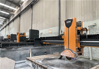該機(jī)采用 PLC 可編程系統(tǒng)和人機(jī)操作界面,輔以高精度旋轉(zhuǎn)編碼器定位及紅外標(biāo)線儀。左右走刀采用變頻器控制,加上結(jié)構(gòu)優(yōu)化升級,左右走刀速度可大大提升,提高產(chǎn)能;上下升降采用液壓升降,結(jié)合厚鍍鉻導(dǎo)柱+耐磨導(dǎo)套,配合間隙小,耐磨精準(zhǔn);主軸箱配套優(yōu)化升級,可兼容高轉(zhuǎn)速;關(guān)鍵部位均采用進(jìn)口零配件,因而具有切割效率高、切割精度高、穩(wěn)定性高、操作簡便等優(yōu)點(diǎn),特別適用于花崗巖、大理石、巖板等板材的切割。